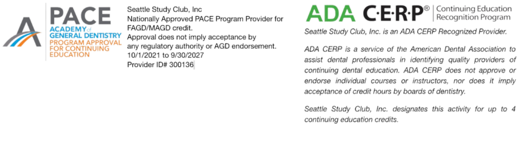 Some information or presentations may include controversial materials or commercial references. Seattle Study Club, Inc, cautions all course participants that there is potential risk to using limited knowledge when incorporating new techniques and procedures into their practices, especially when the continuing education program has not provided them with supervised clinical experience in the techniques or procedures to ensure that they have attained competence.